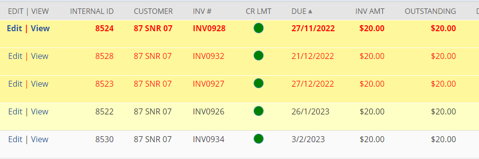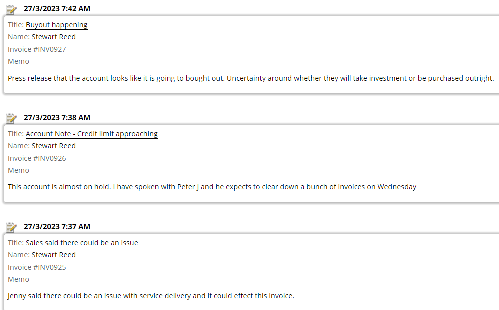 Notes are stored against each invoice (and each customer) so all your comments are easily available for access and review.