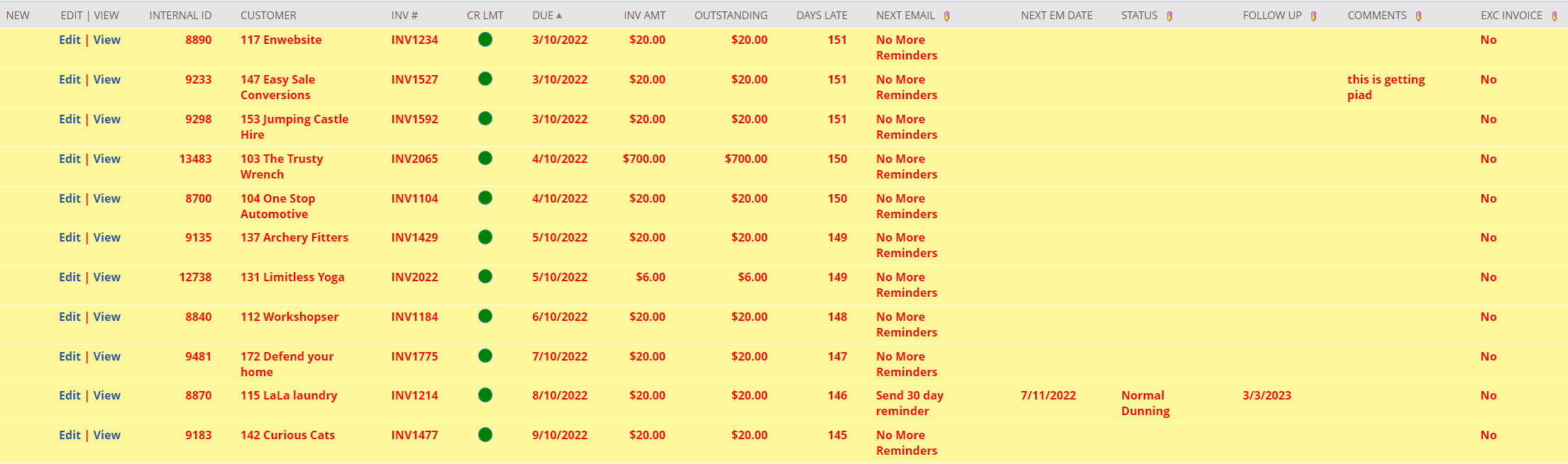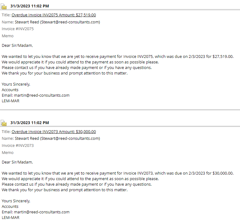 Every Dunning Reminder is stored and linked to each invoice - allowing you to quickly come up to speed on all follow up activity for that invoice.