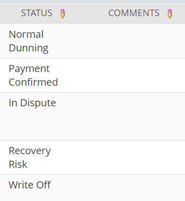 Immediately know the status of each invoice. Simple, and easy to use, the Status can be progressed from Normal Dunning to Payment Confirmed to In Dispute to Write Off.